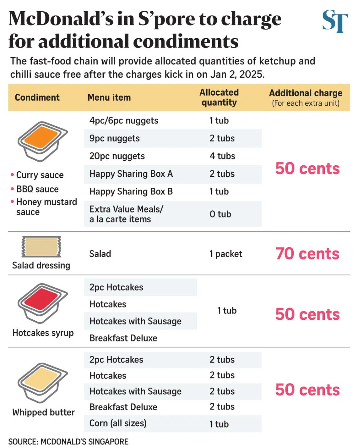 SINGAPORE - McDonald’s decision to charge customers if they ask for additional sauces from Jan 2, 2025, has drawn fiery comments online and left a sour taste in their mouths.
