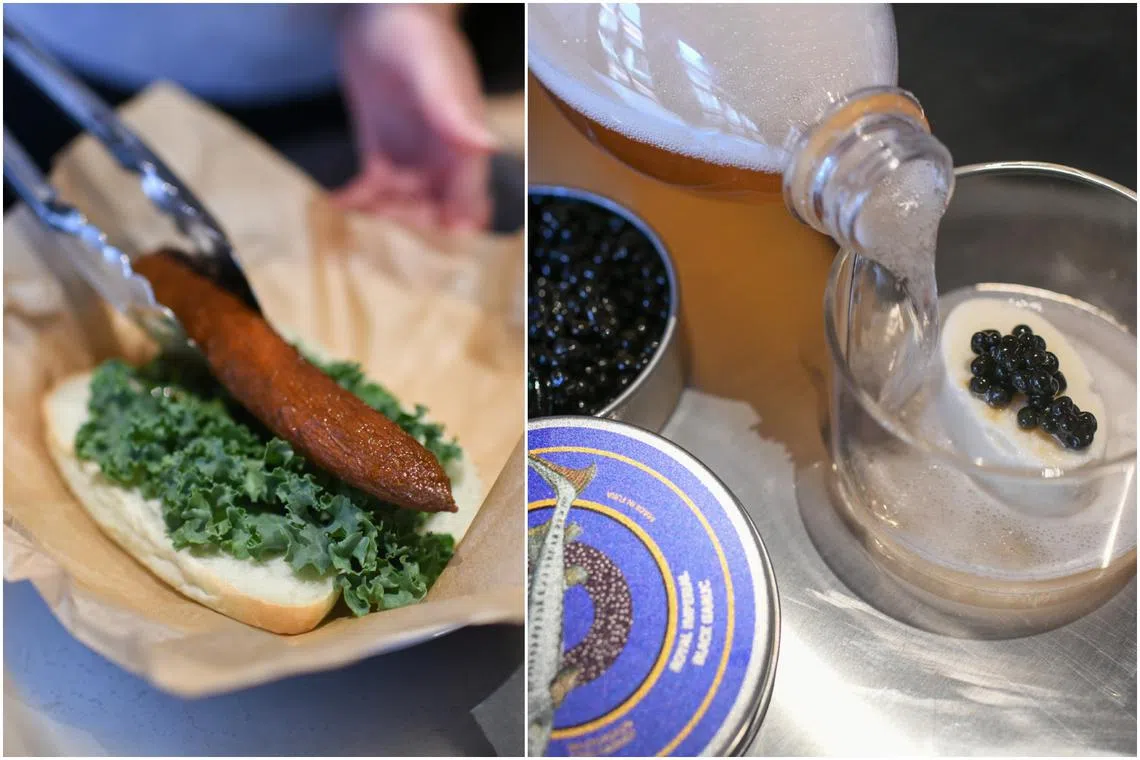For instance, there is a hot dog made of a slow-cooked carrot “sausage’” wrapped in a green-tinged spirulina bun, a blue kelp ice-cream popsicle and a black garlic “caviar” that is used on the tasting menu and in a cocktail called Caviar Papi.