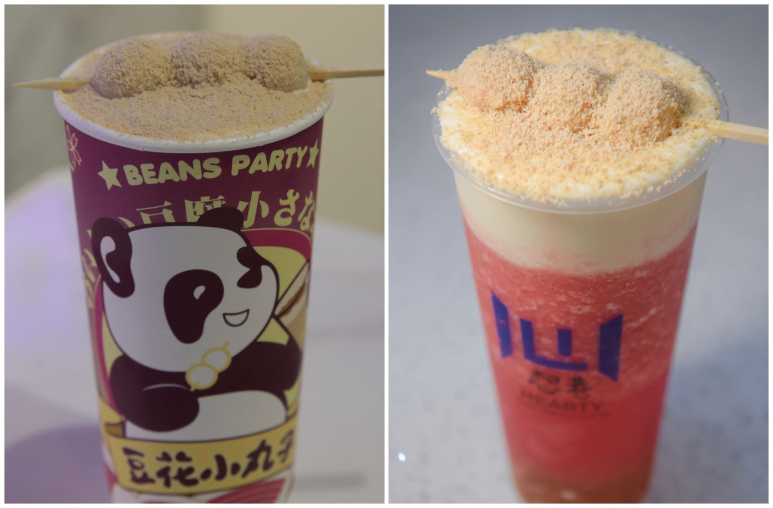 At least three brands are offering tea drinks mixed with soya bean milk - topped with some variation on the theme of "creamy" and, crucially, three mochi balls on a skewer perched on top.