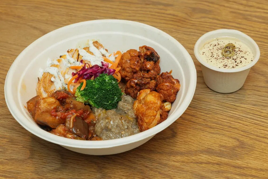 EN Seeds customers customise their warm salads. Featured here is chicken breast, shuka shuka, baba ghanoush, baked cauliflower and hummus.