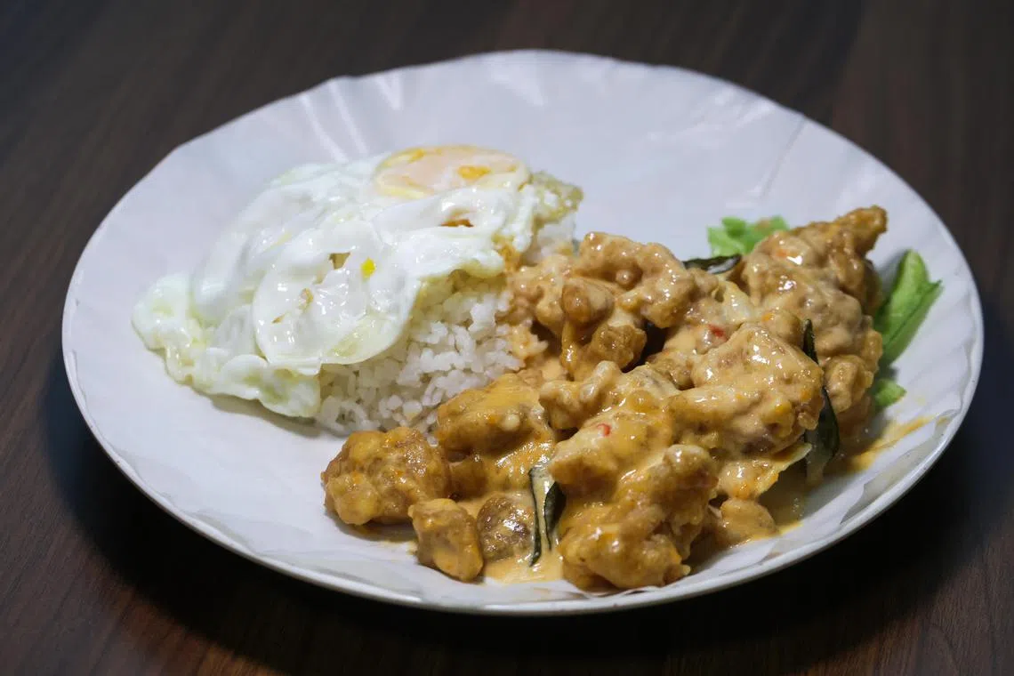 Salted Egg Chicken with fried egg and rice from New Station Rice Bar.