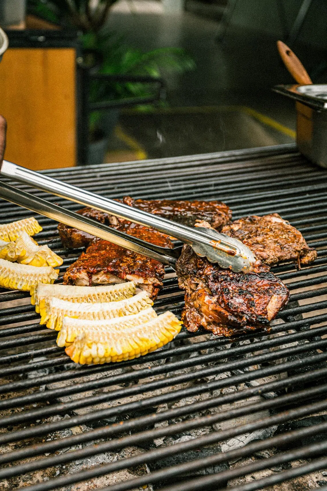 Jerk meats and corn ribs are cooked over charcoal at Camp Caribbean.