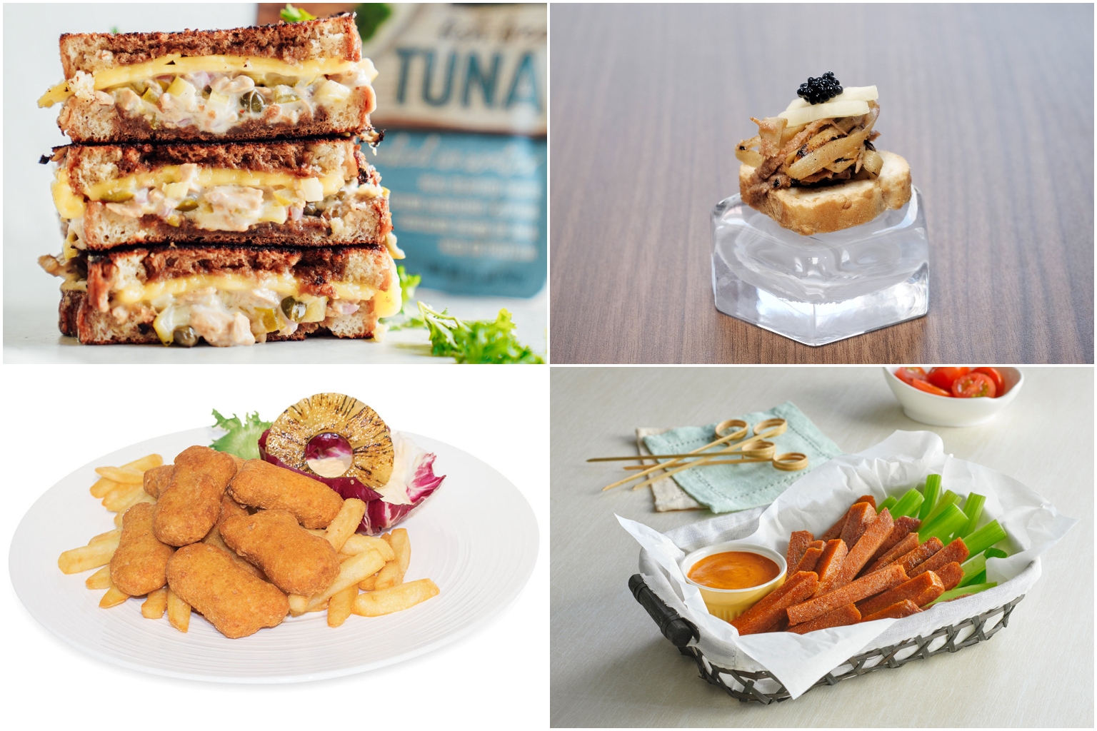 (Clockwise from top left) Good Catch's Tuna Melt Sandwich, ALT Plus' Waygu with caviar, Ayam Brand's fried luncheon "meat" and CP Foods' Meat Zero nuggets.