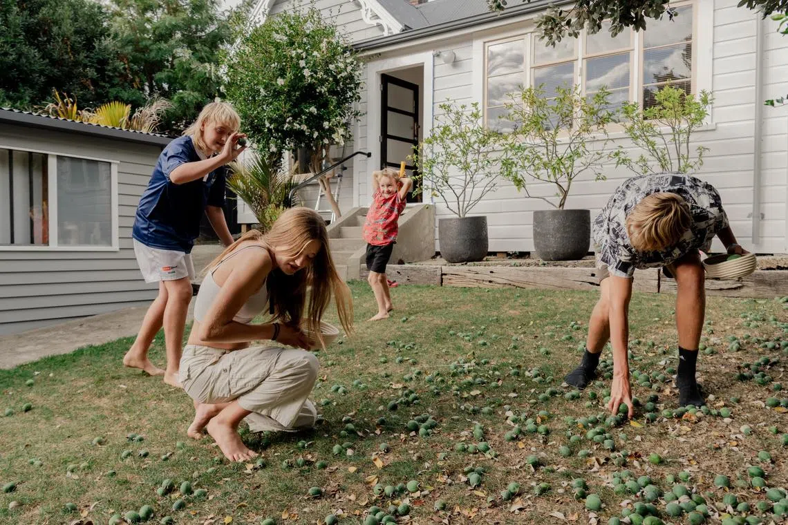 (From left) Xavier Dickson-Paterson, Lola-Rosa Seton, Tui Seton and Jesse Dickson-Paterson collect feijoa fruits in their garden in Nelson, New Zealand. The fruit is so abundant in autumn that people buy it only in cases of extreme desperation.