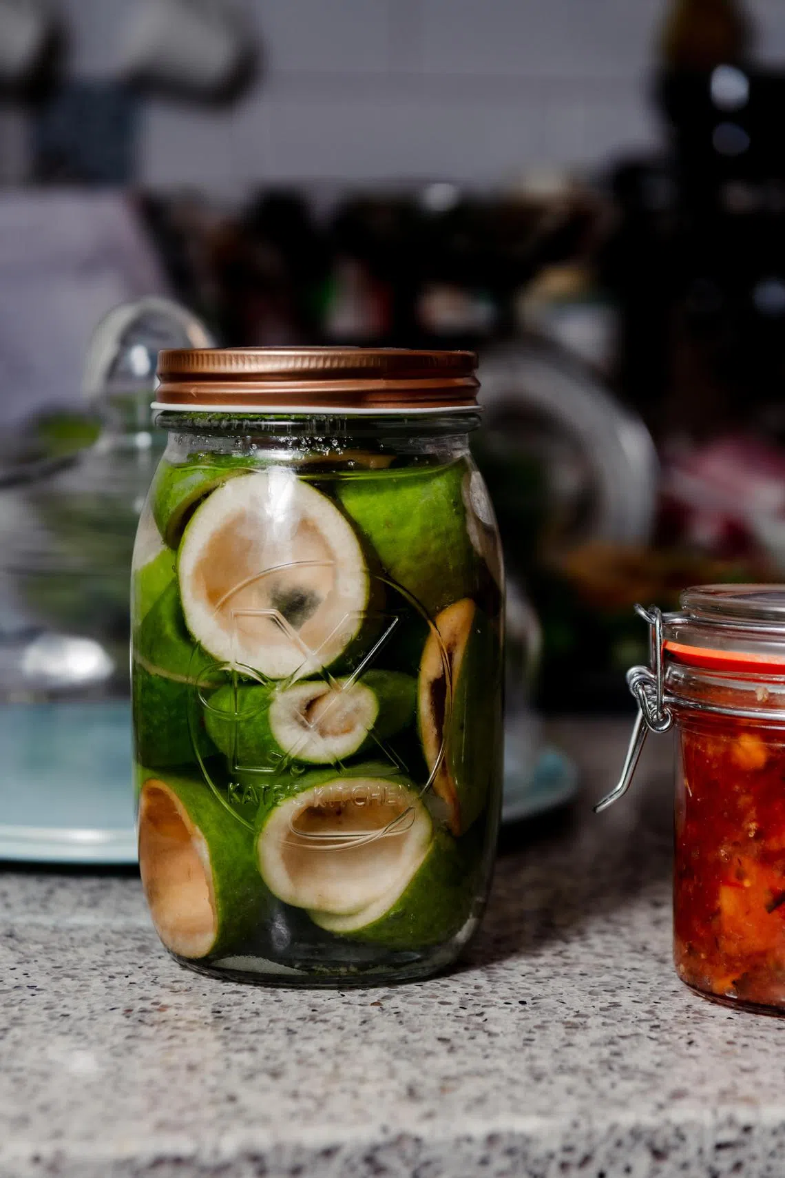 Feijoa skins soaking in sugar water. Like the kiwi fruit, which originated in China, and the kiwi, a native bird, the feijoa has become for many here a quintessential symbol of New Zealand.
