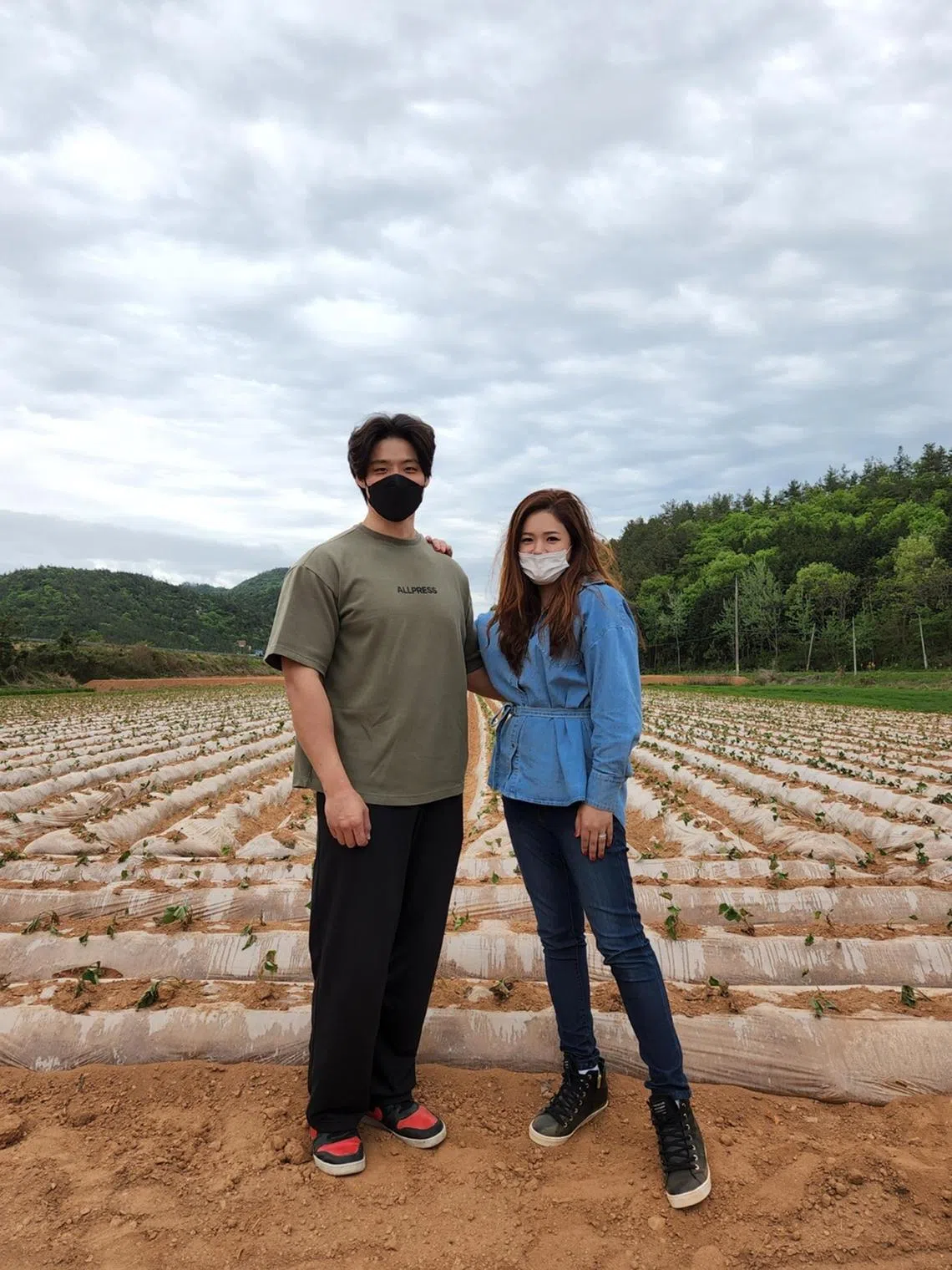 SoGoodK's founder Olivia Lee (right) with farmer Kim Kyung-jin at his Haenam farm in 2022.