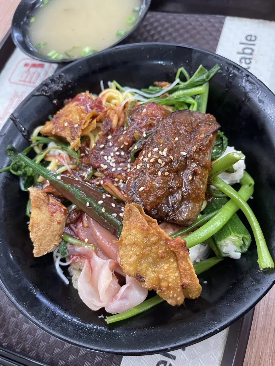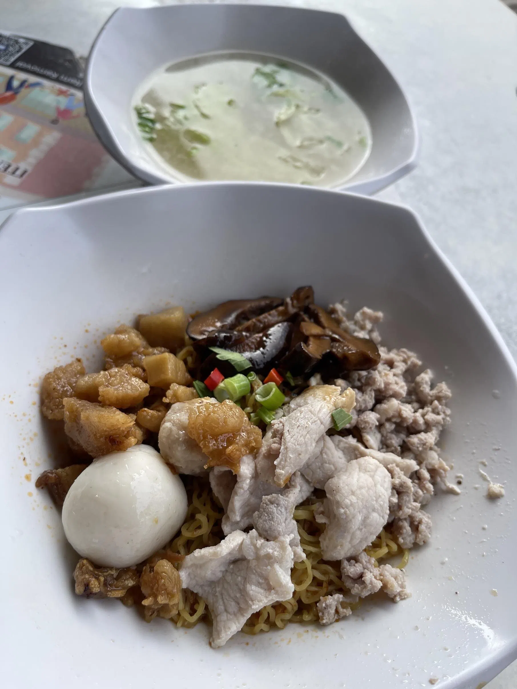 What tops her noodles are freshly cooked lean pork, as well as fishball and pork ball. But there is no liver.