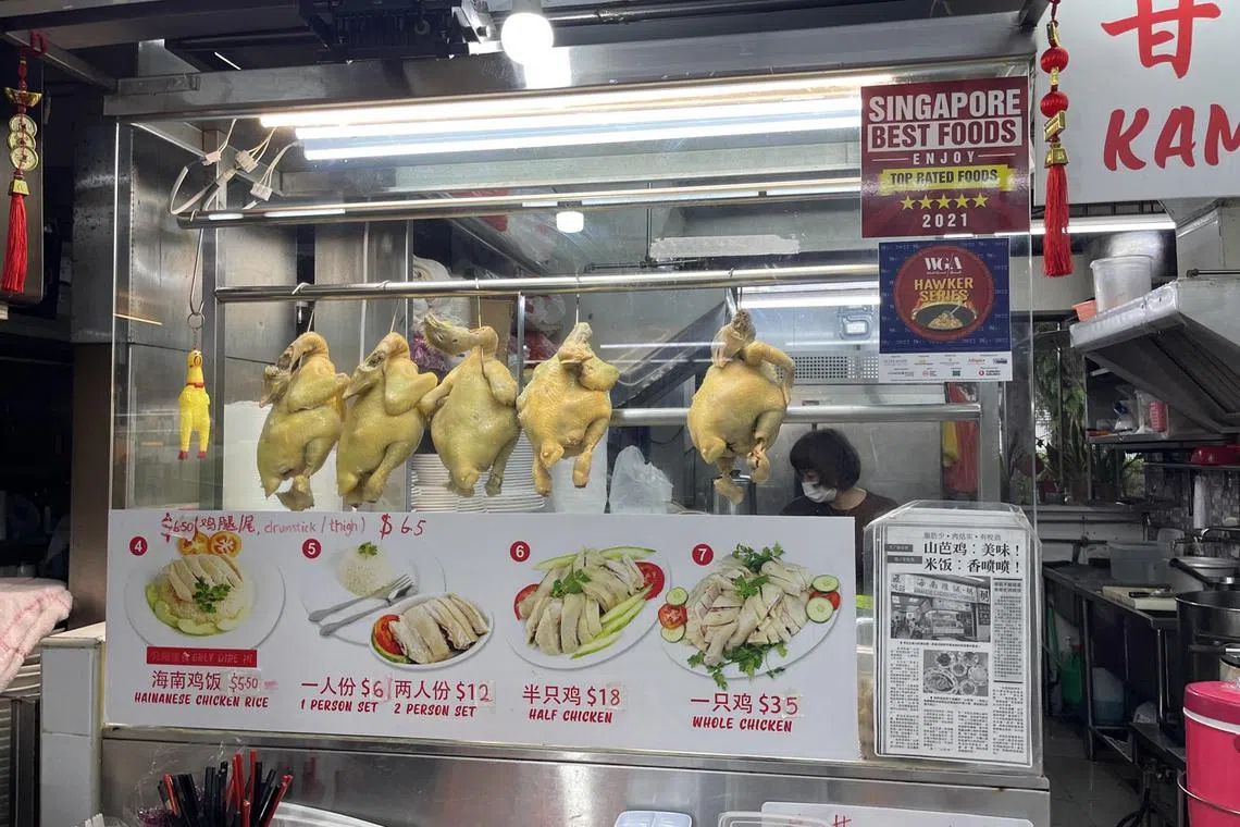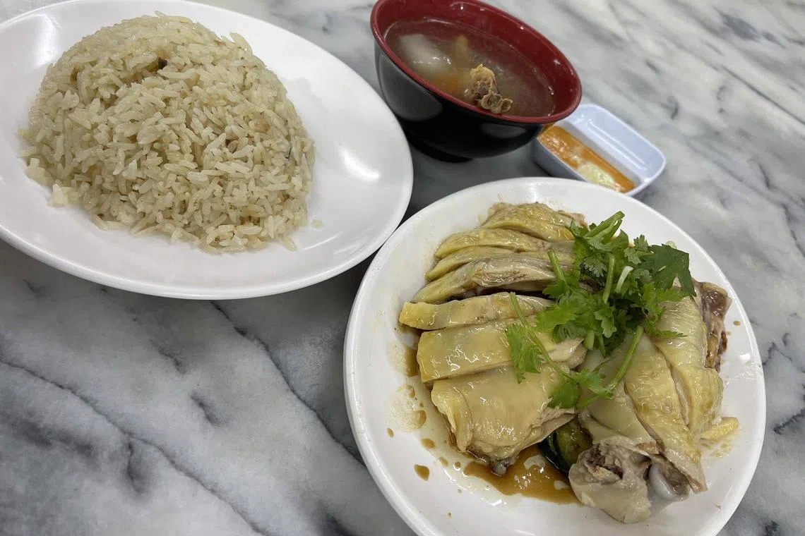 It uses kampung or free-range chicken, which has yellow skin and firmer flesh than the pale broiler chickens used by many hawkers. It has better flavour too, with a nice bite and a thick, gelatinous skin. A plate of chicken rice costs $5.50 and the stall accepts CDC vouchers.