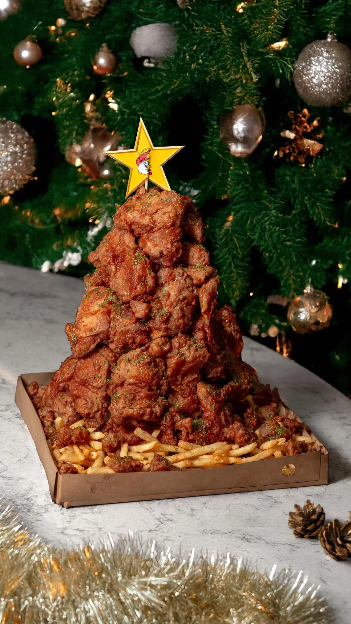 This Christmas tree is adorned not with baubles and fairy lights, but with crisp chunks of fried chicken.