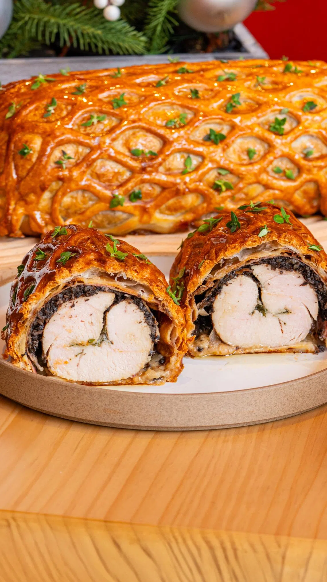 Burnt leeks and mushroom duxelles add another layer of earthy umami, and a fragrant thyme and maple glaze gives the dish its classic golden shine.
