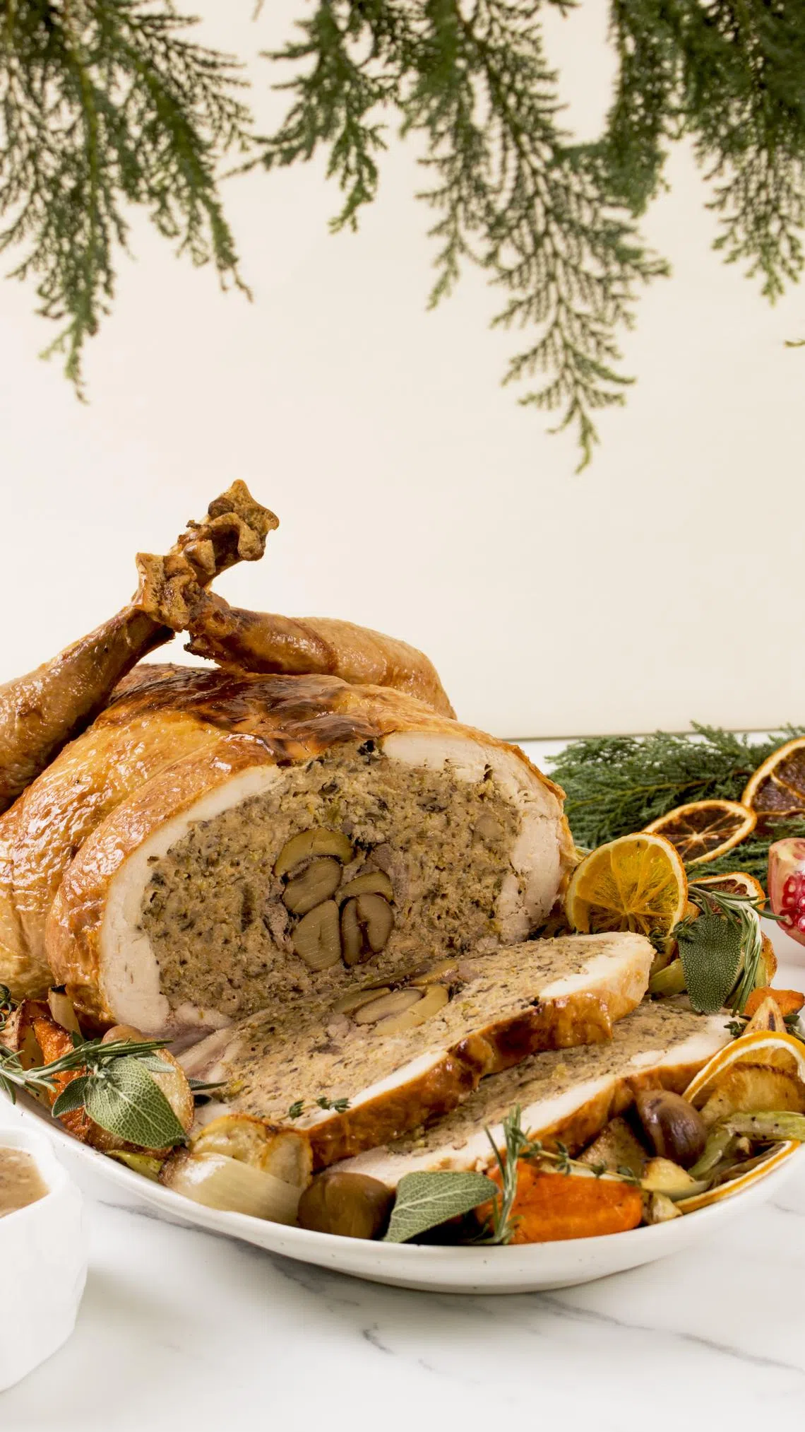 The turkey is then slow-roasted till golden, and served with roasted vegetables.