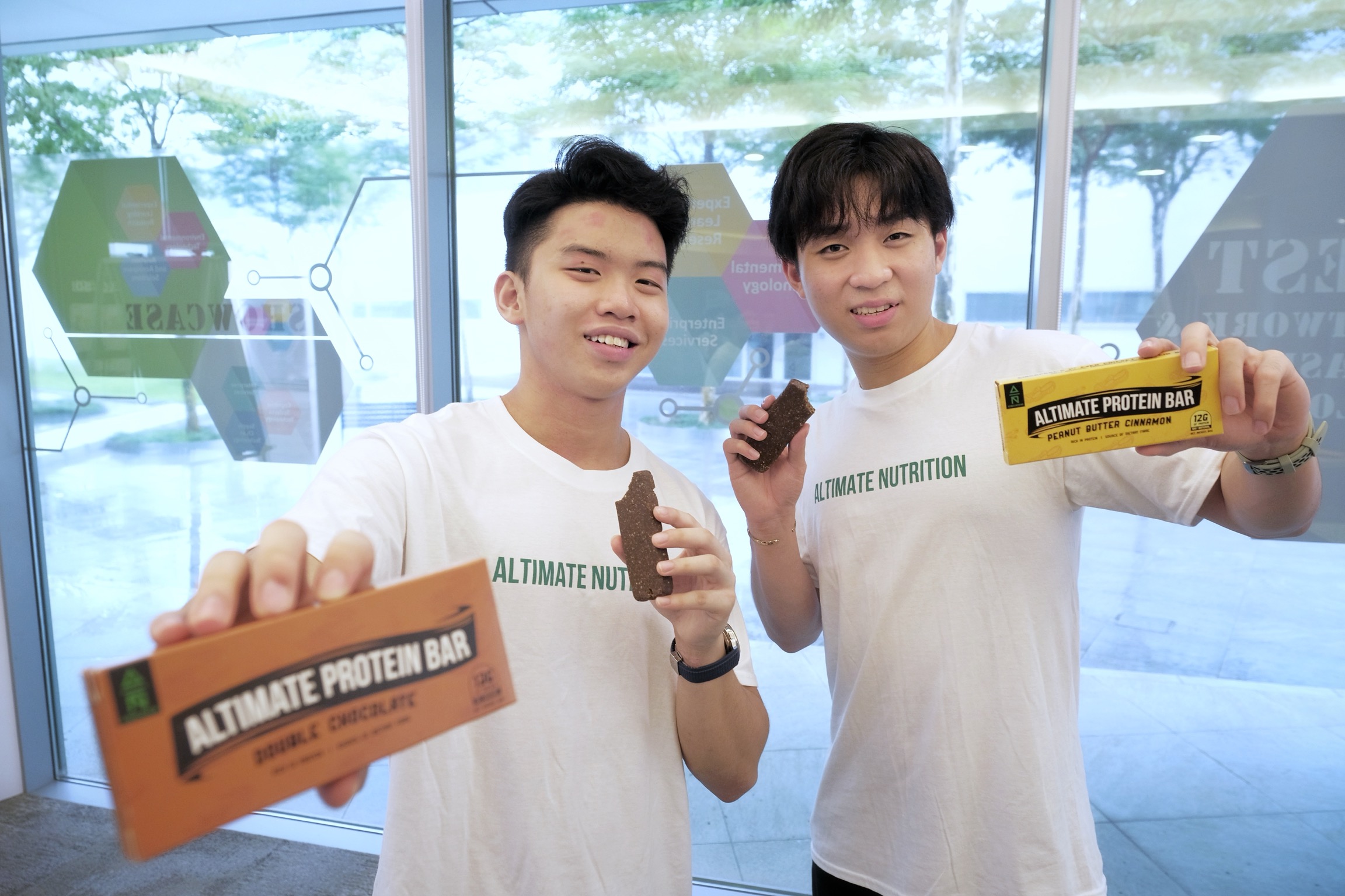 Republic Polytechnic students and Altimate Nutrition co-founders John Lee (left) and Gavriel Tan pose with their protein bars made with cricket flour, on April 6, 2021.