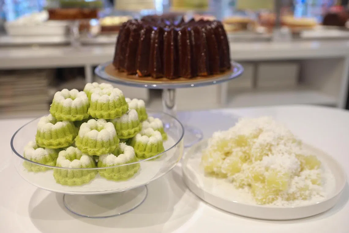 New cakes at Chalk Farm include Mango Meringue Cake ($12 a slice); Pistachio Lemon Cake ($11 a slice); Butter Brilliance ($7.80 a slice), a butter bundt cake coated with chocolate; and Two Cheese Bingka Ubi ($9.30 a slice) topped with gouda and parmesan custard. His colourful Kueh Lapis ($7.20 a slice) is back on the menu, and new kueh include Puteri Ayu ($5.50 for three) and Kueh Ubi ($5.50 for three).