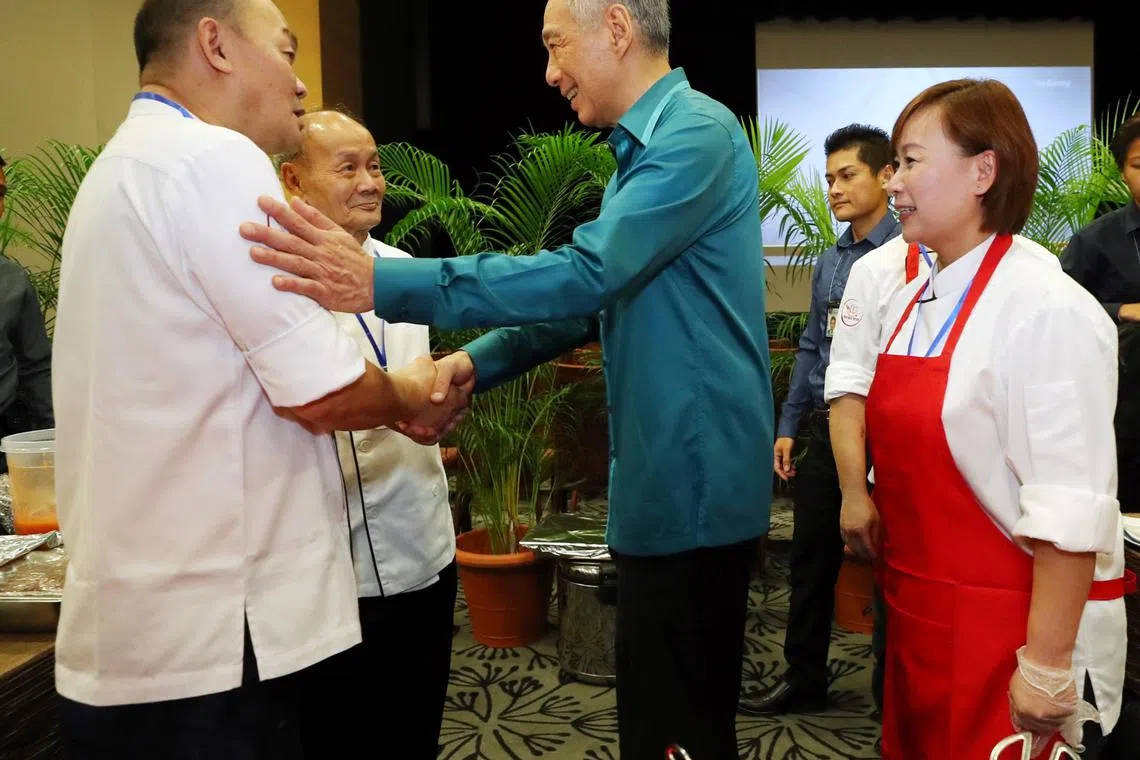 Prime Minister Lee Hsien Loong with Mr Raymond Kiang (far left), his sister Susan (right) and his father Kiang Joon Toh, one of the pioneer chefs who developed Chatterbox chicken rice at Mandarin Hotel.