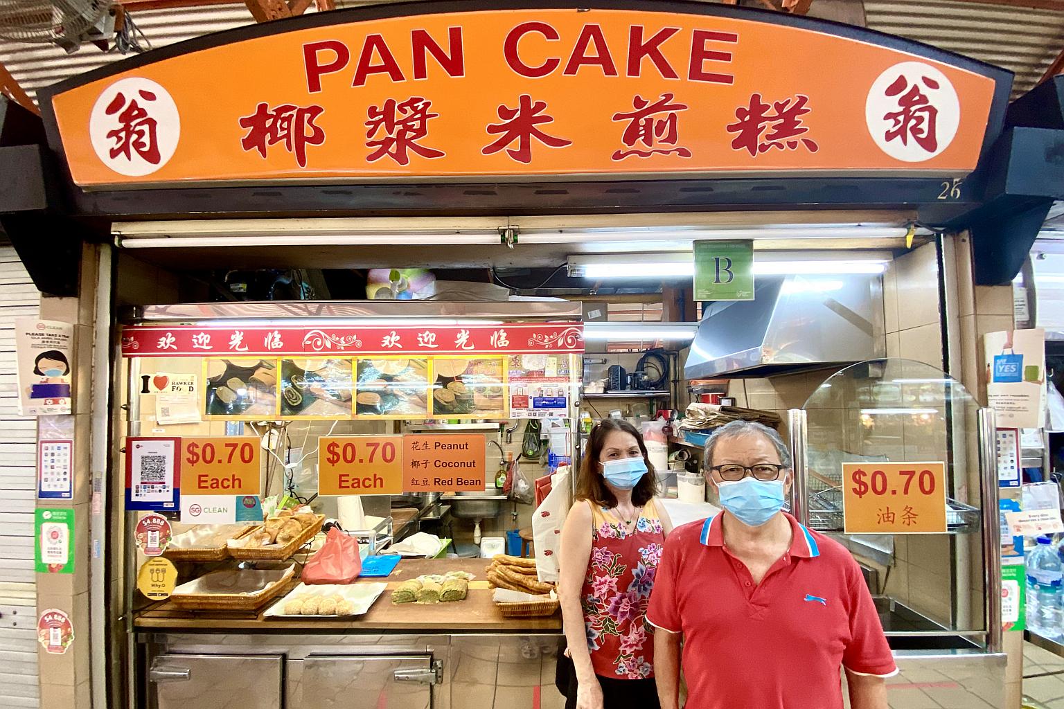 Madam Loh Giat Tin and her husband Ong Kheng Kiat, who run the 27-year-old Weng Pancake stall at Maxwell Food Centre.