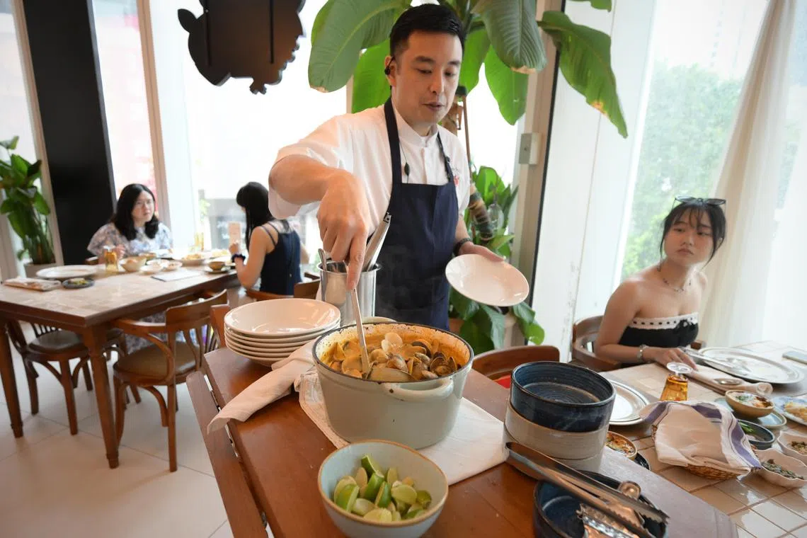Chef Anthony Yeoh at his restaurant, Summer Hill, serving clam “mouclade” to his guests.