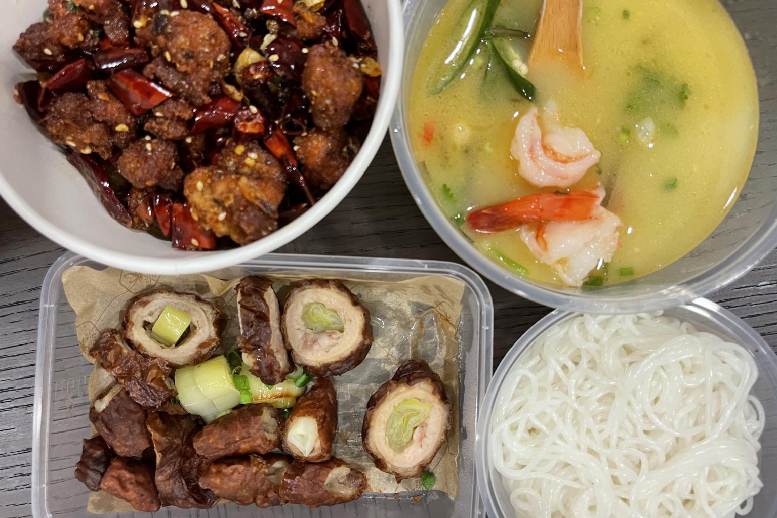 Clockwise from top left: Find The Chicken In The Chilis, Fried Crispy Pig's Intestines and King Prawns Noodle (soup with rice noodles packed separately).