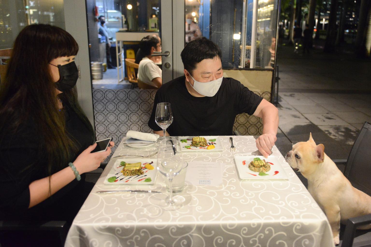 The New Paper food columnist Yeoh Wee Teck (centre), his French bulldog, Rufus, and STFood online editor Hedy Khoo tasting the food prepared by chef Justin Quek with products from Furry's Kitchen.