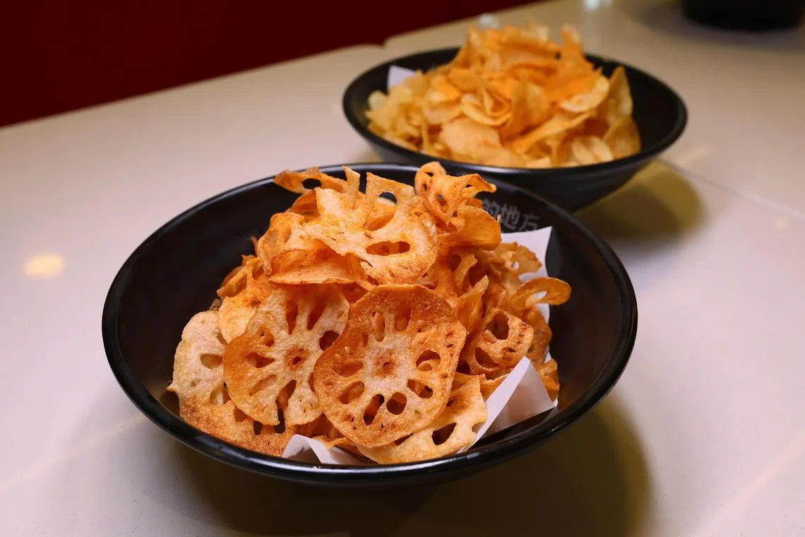 At A Hot Hideout, lotus root and potatoes are deep-fried till crisp before being added to the Mala Xiang Guo stir-fry.