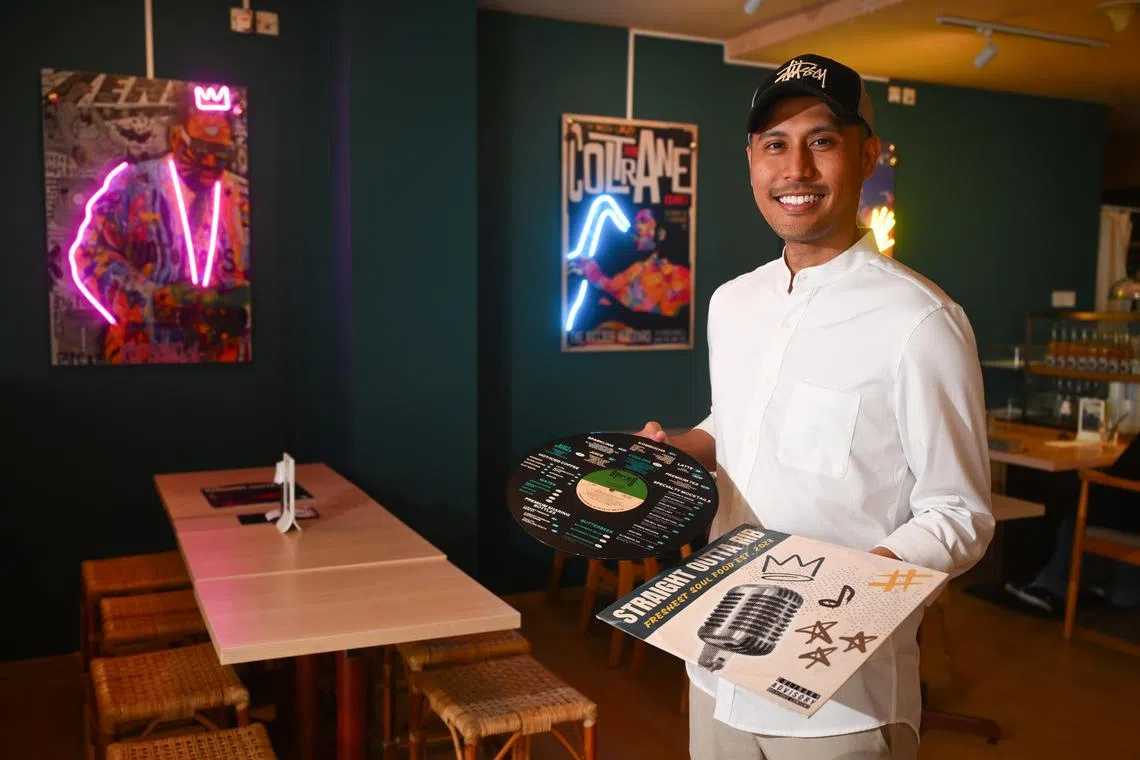 This time, he roped in his wife, now aged 34, who works at a Chinese internet tech firm, as a silent partner. They spent $30,000 on the 950 sq ft unit, which seats 25 indoors and 15 outdoors, and has an R&B theme with menus printed on vintage vinyl records and album sleeves.