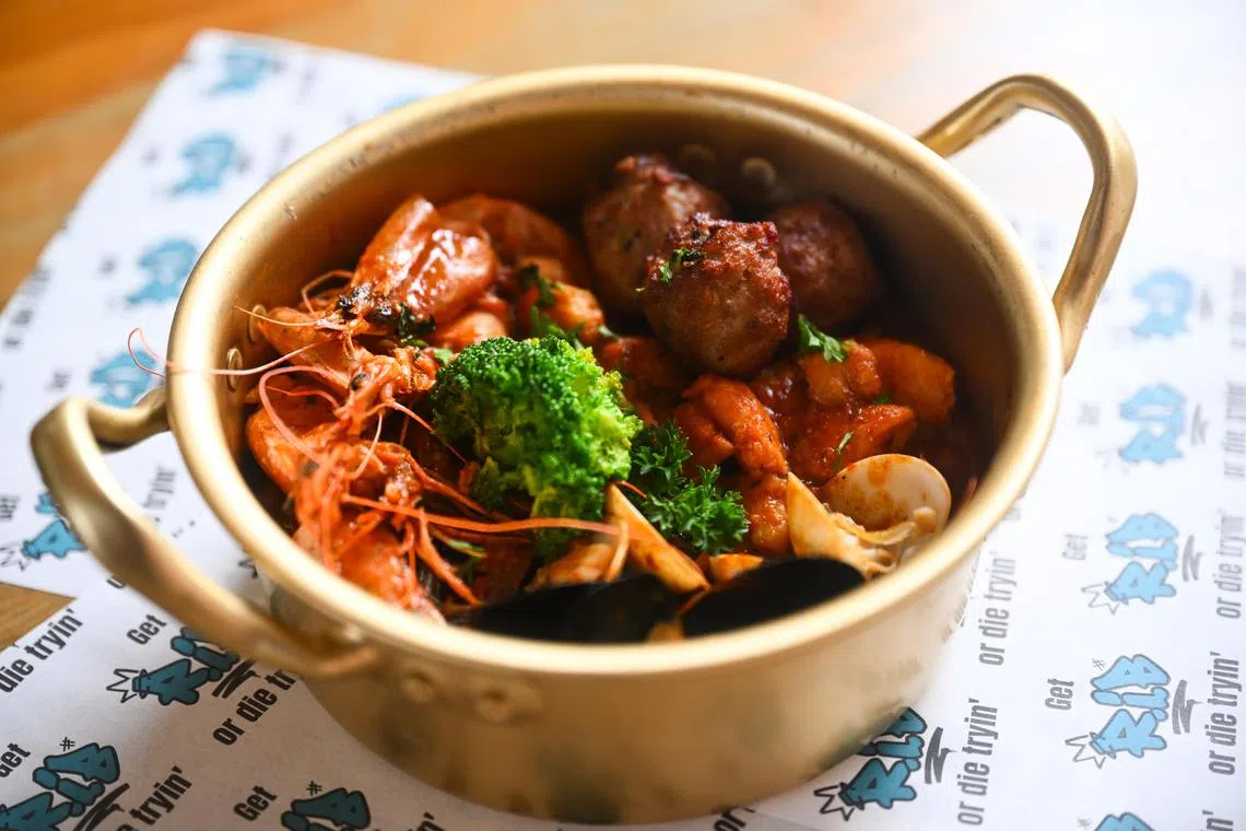 As well as the tongue-tingling Cajun Jambalaya ($29.90+), which is spicy Cajun rice with a medley of prawns, clams, mussels, catfish and beef meatballs.