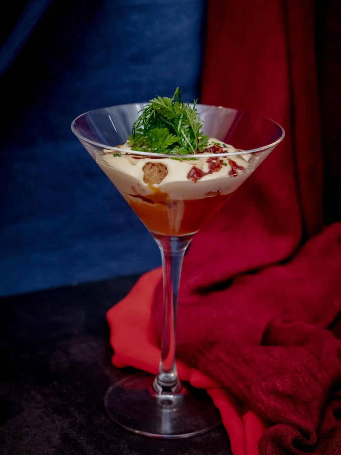 Still, one cannot fault Amor for trying. And try it does, with admirable heart. There is an egg dish that takes a pretty convincing stab at originality. The Happy Eggggg ($18++) is served almost dessert-like in an elegant martini glass, layered with roasted pumpkin coulis, a 65 deg C onsen egg, truffle sabayon, crispy jamon chips, brown butter sourdough croutons, as well as flecks of dill and chervil.