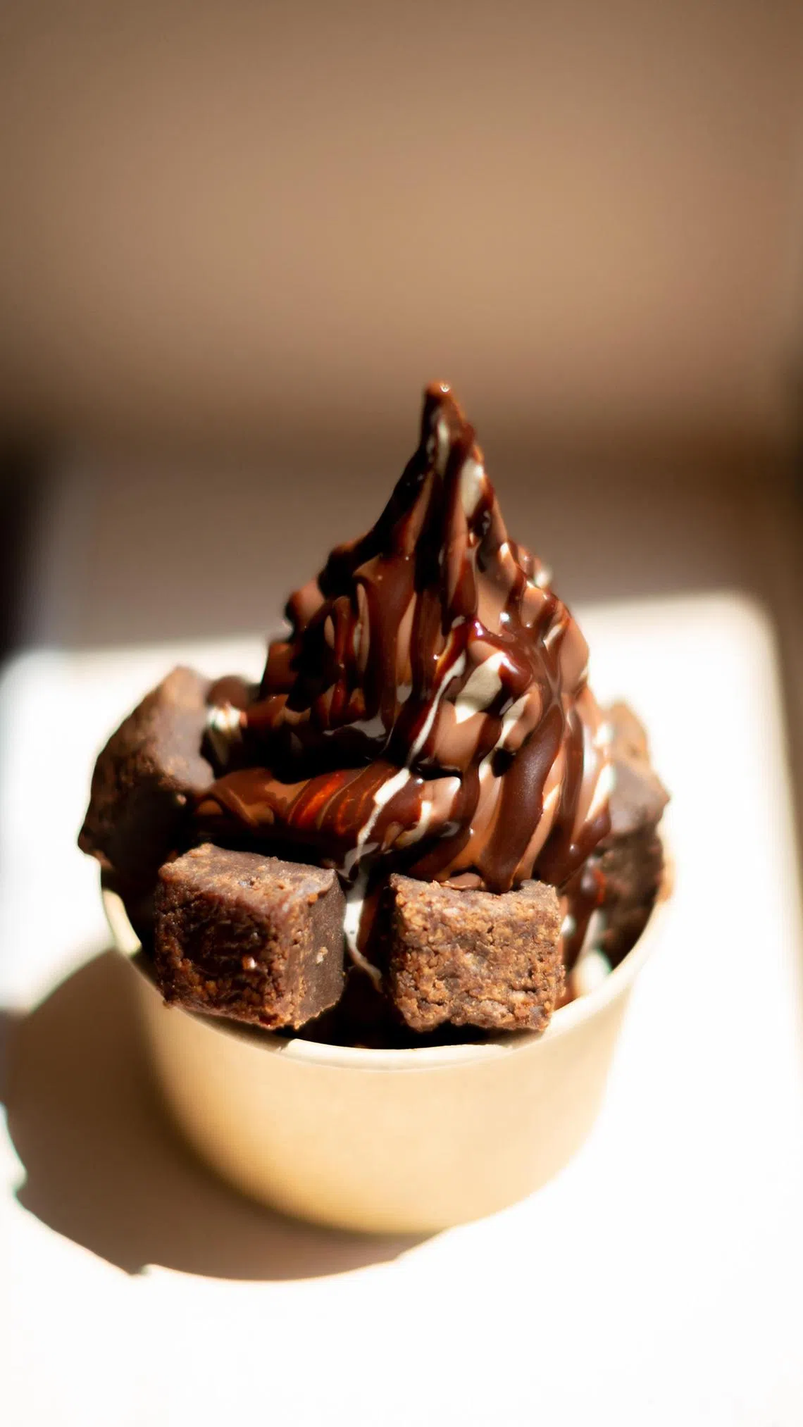 Chocolate hard shell, chocolate sauce and brownies on soft serve at Vaca’s Creamery in Chicago on June 17.
