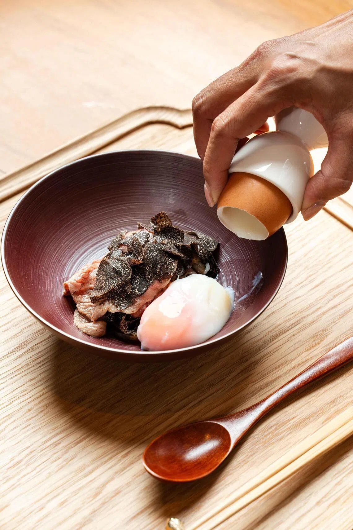 Ushidoki's signature Ozaki Beef Sukiyaki is served with a soft-boiled egg.