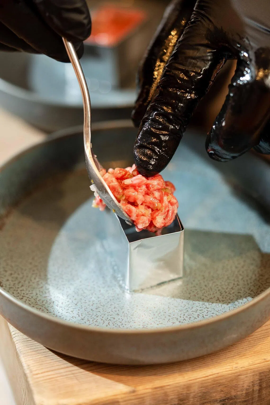 Ushidoki's beef tartare is served on a bed of finely shredded deep-fried potatoes.