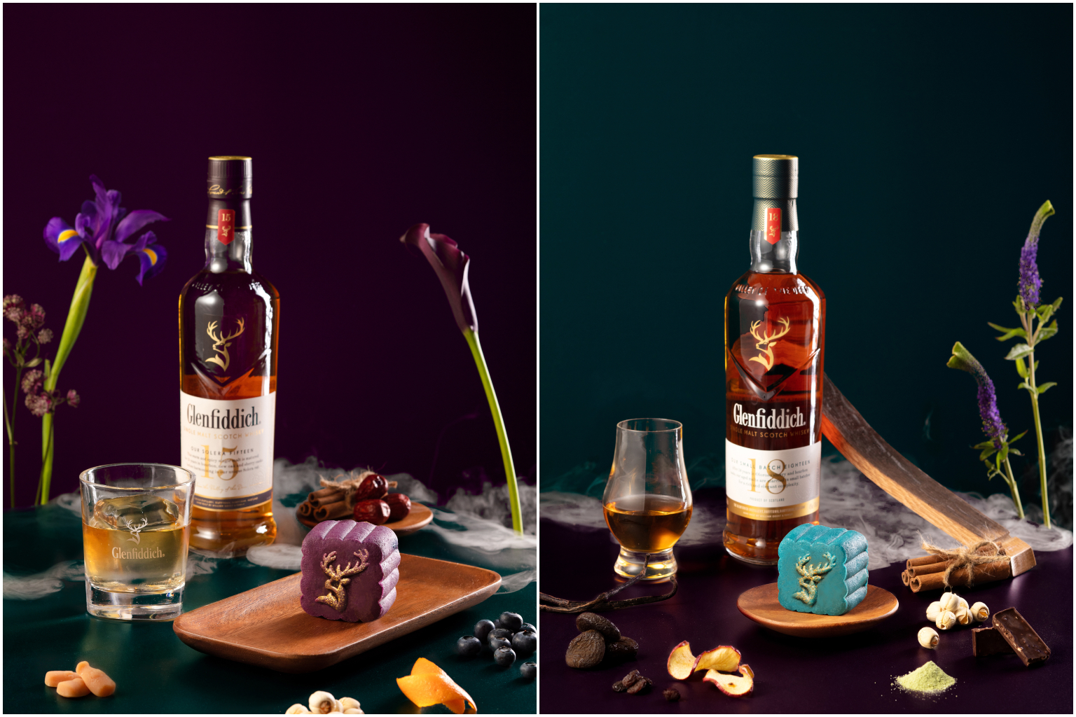 The mooncakes are inspired by and infused with flagship Glenfiddich whiskies - such as the Glenfiddich 15 Year Old, which goes with a purple, acai snowskin confection that envelops a Hokkaido milk filling and whisky-infused chocolate praline.