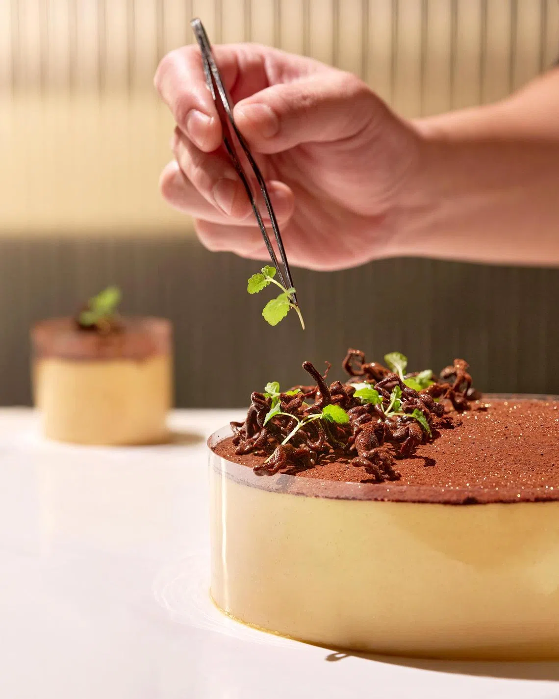 A layer of cocoa powder forms the “edible soil”, along with chocolate twigs and a dried and pressed four-leaf clover, to complete the garden theme.