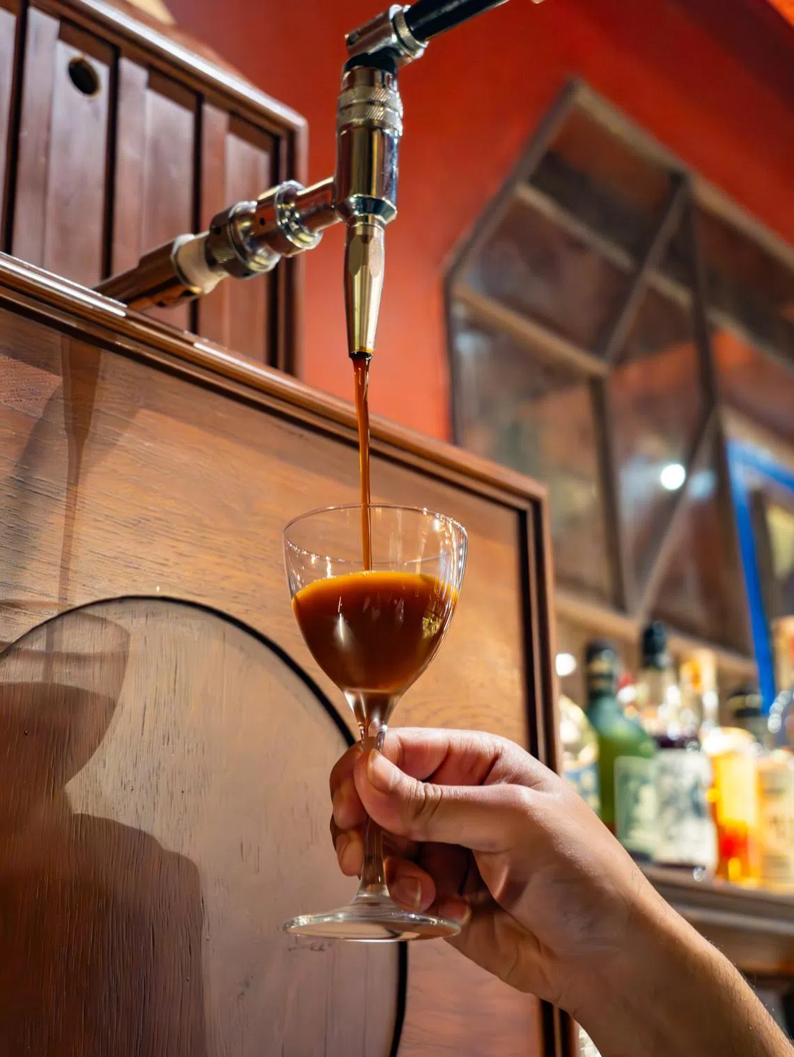The drink is served from a keg charged with nitrogen, which gives it a frothy top, similar to that of a signature Indian filter coffee.
