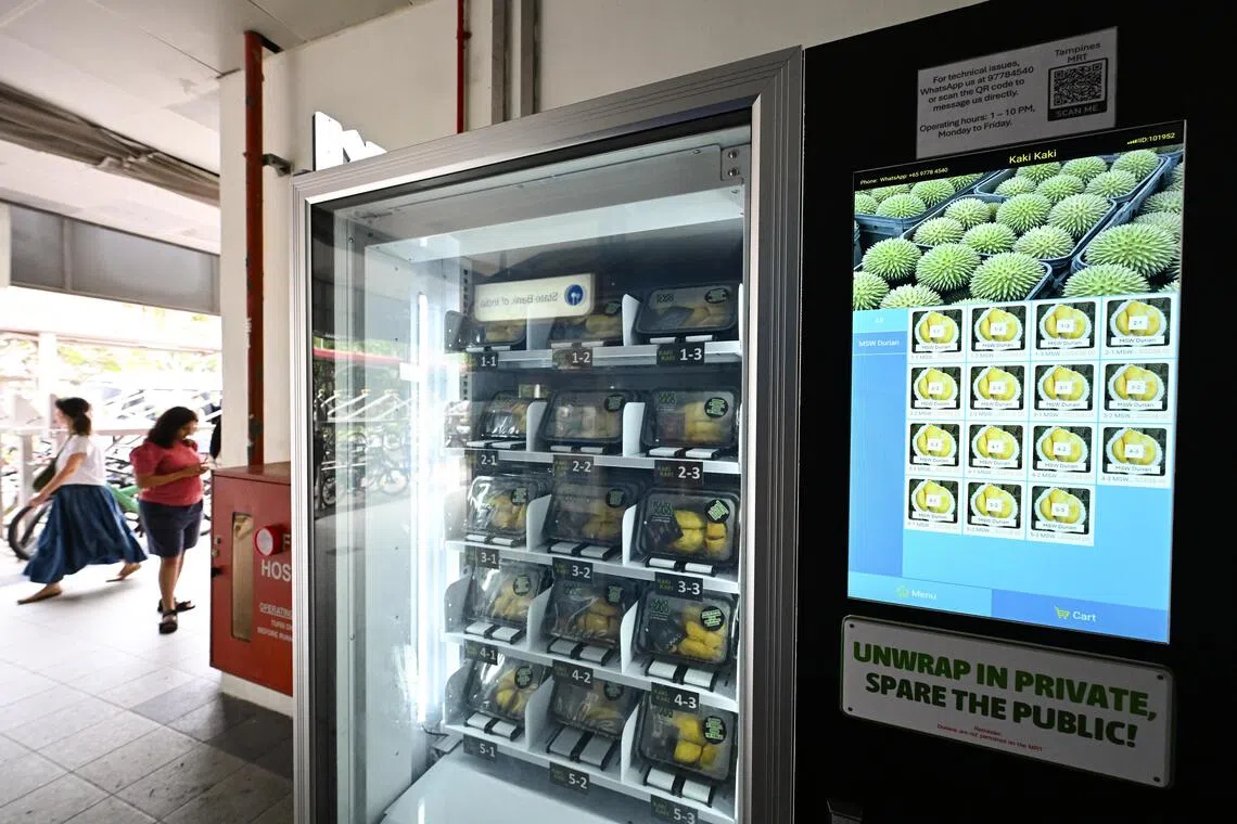Durian seller Kaki Kaki's vending machine debuted at Tampines MRT station with boxes of Mao Shan Wang in January.