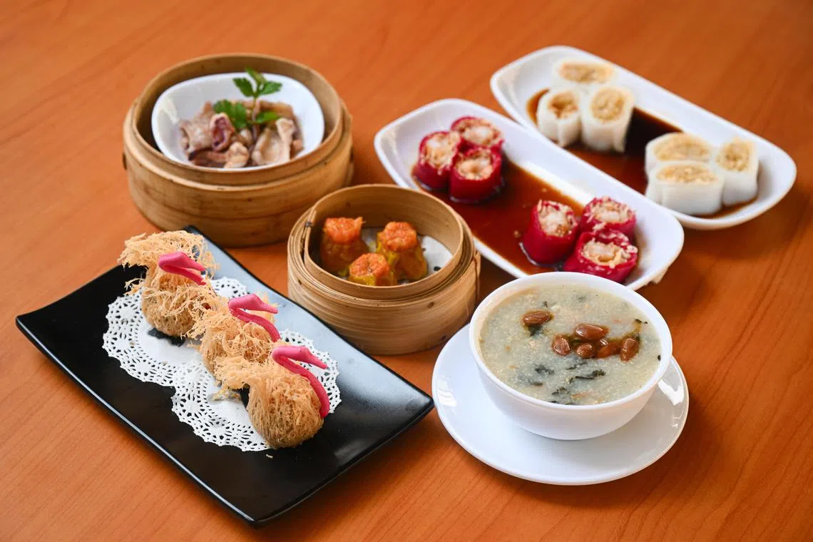 Richman Dim Sum's food includes (from left) Crispy Taro Swans, Har Cheong Squid, Muah Otah Siew Mai, Cantonese Dried Vegetable & Salted Pork Porridge, Beetroot & Rice Crisps Rice Rolls and Crispy Popiah Rice Rolls.