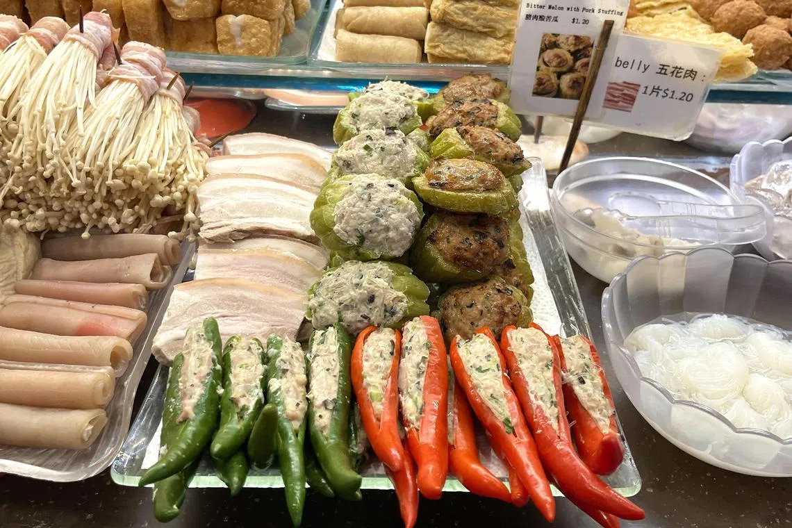 The eatery also offers yong tau foo stuffed with a meat paste made using fresh minced pork. These premium items, such as bittergourd and chilli stuffed with pork, are priced at $1.20 each.