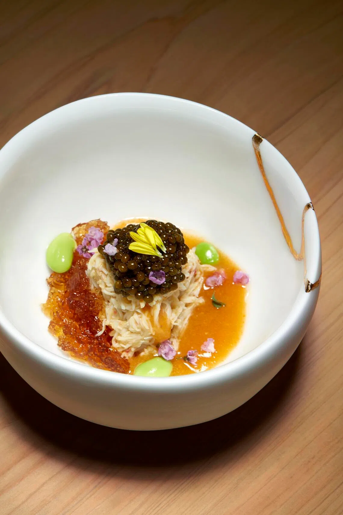 The meal starts on a high with a series of appetisers – kinki fish in a delicate dashi; echizen gani snow crab topped with caviar; and Hokkaido uni paired with sweet tomato, okra and white asparagus.