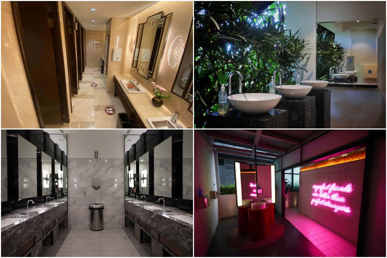 (Clockwise from left) Toilet at The Fullerton Hotel Singapore, Tropical Montane Orchidetum, lyf Funan Singapore and The Shoppes at Marina Bay Sands.