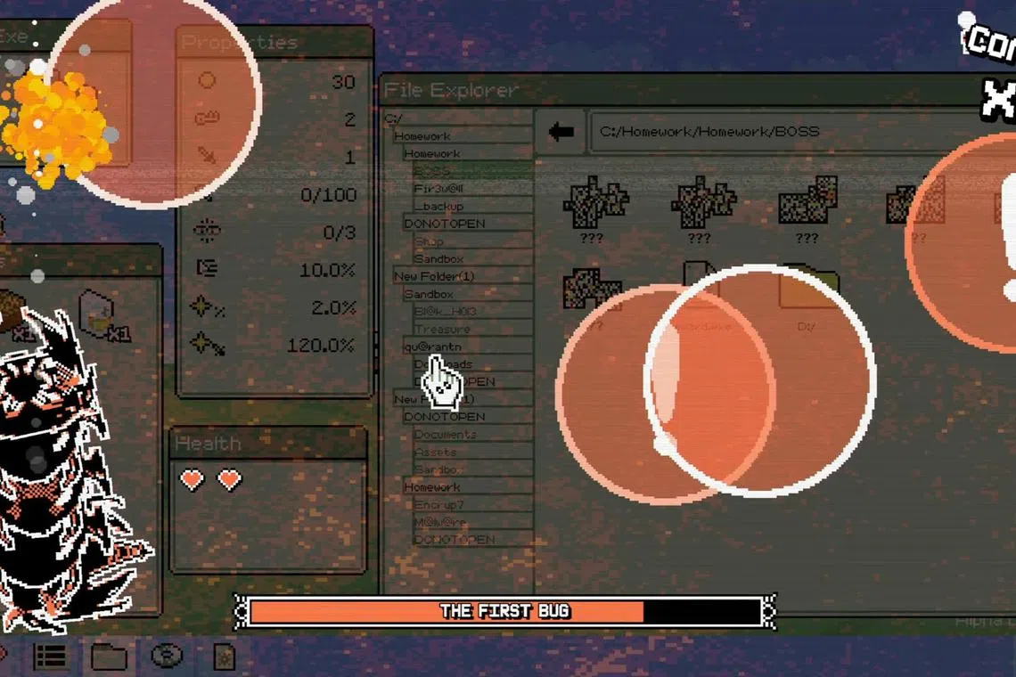In Identifile, players take on the role of a computer cursor battling viruses in a file explorer interface, while collecting .exe files to upgrade their abilities so they can reclaim their operating system.