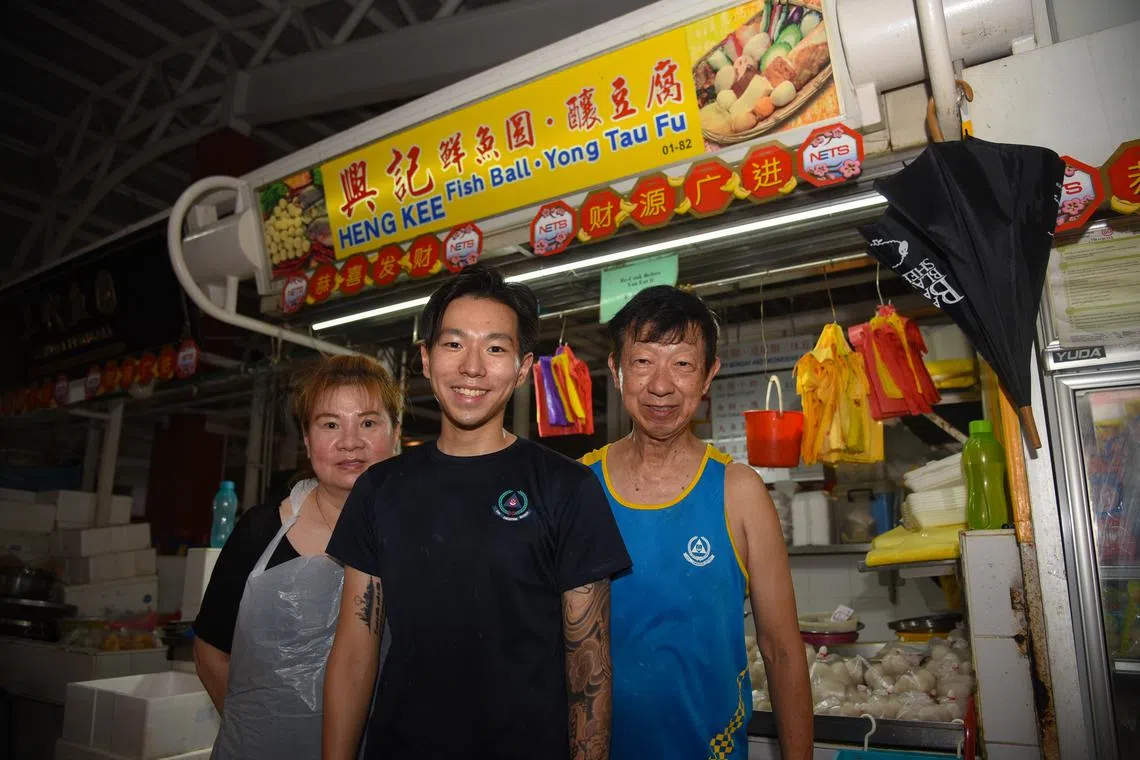Mr Delonix Tan (centre), with his father Tan Yew Seng and mother Cindy Kho, at their Kim Keat Palm Market stall Heng Kee Fish Ball & Yong Tau Fu.