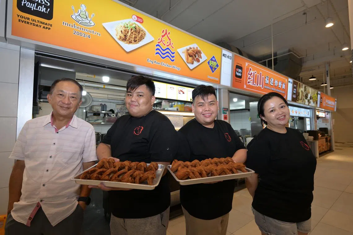Brothers Brendan (second from left) and Nicholas Lim (third from left) run the Eng Kee Chicken Wings stall at Buangkok Hawker Centre. They are with their aunt Jaslynn Puah, who runs another outlet, and uncle Jack Lim, who owns the franchise.