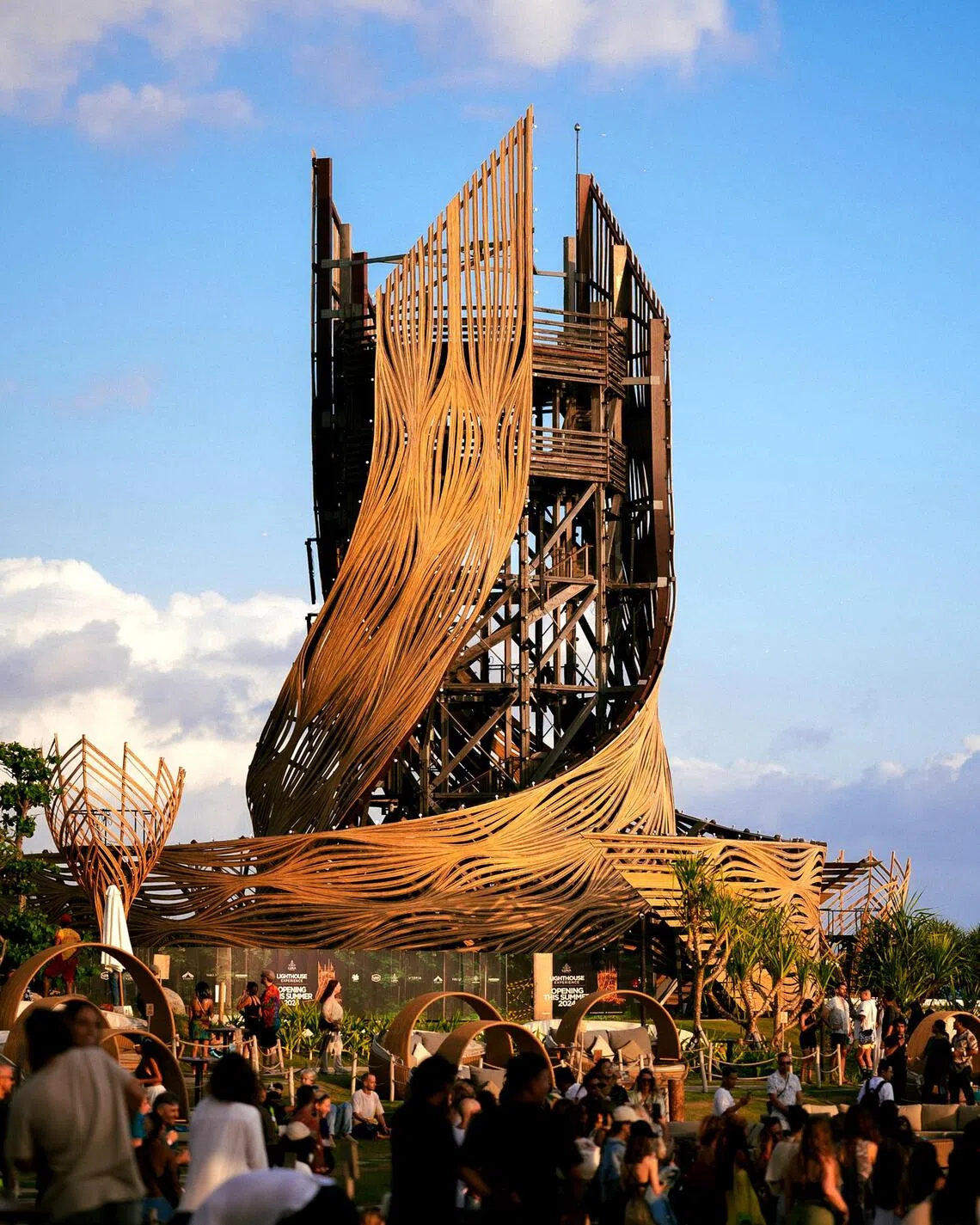 The sculptural bamboo THK Tower is designed by French architect Arthur Mamou-Mani and Balinese bamboo artisan I Made Wirahadi Purnawan.