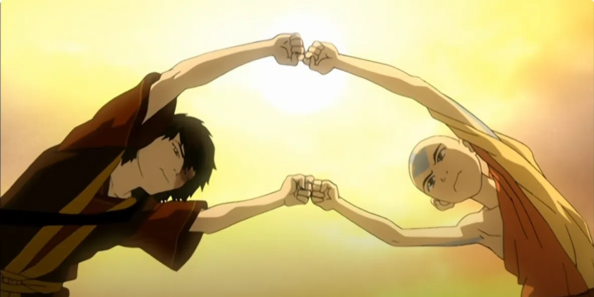 Characters Zuko and Aang from Avatar: The Last Airbender performing the “dancing dragon”, which imitates the fusion dance from Dragon Ball.