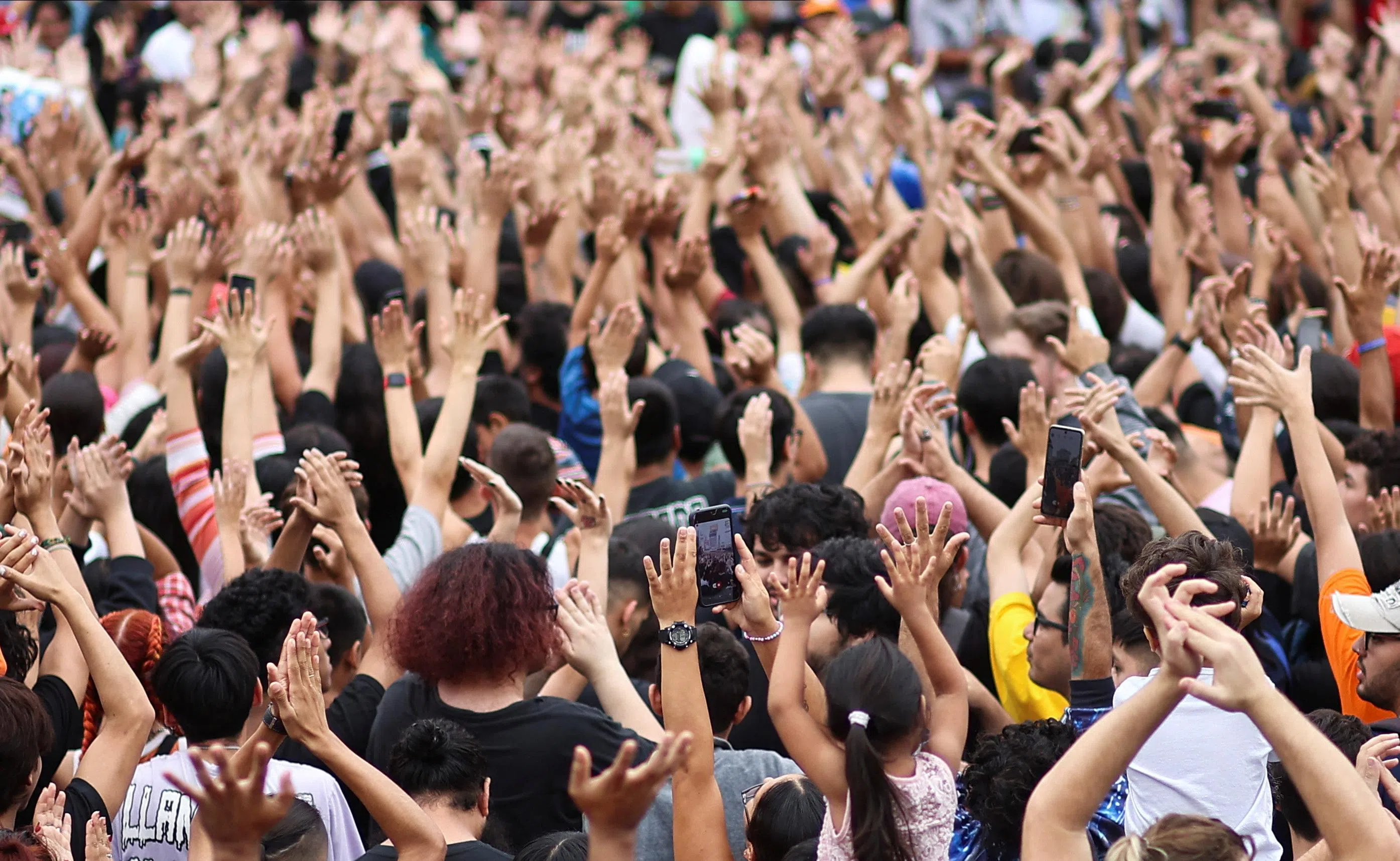 Argentine Dragon Ball fans performing a “spirit bomb” as they bid a final farewell to Japanese manga comic creator Akira Toriyama, at the Obelisk in Buenos Aires, Argentina, on March 10.