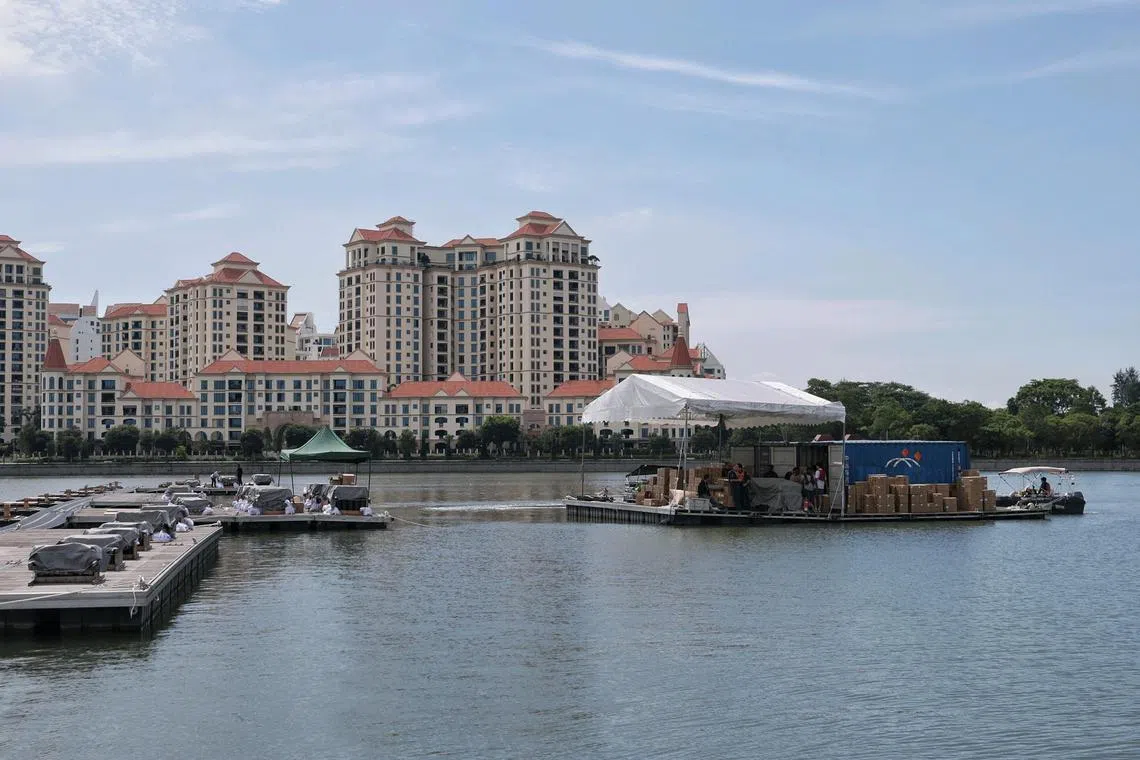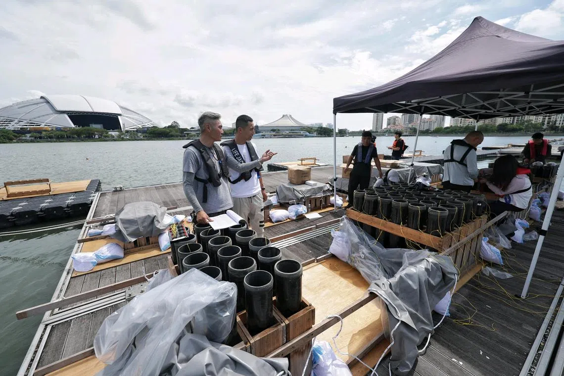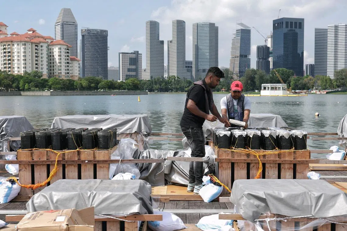 Technicians preparing fireworks for the Mediacorp Let’s Celebrate 2025 countdown show happening on Dec 31. The overhead covering protects the fireworks from the elements.