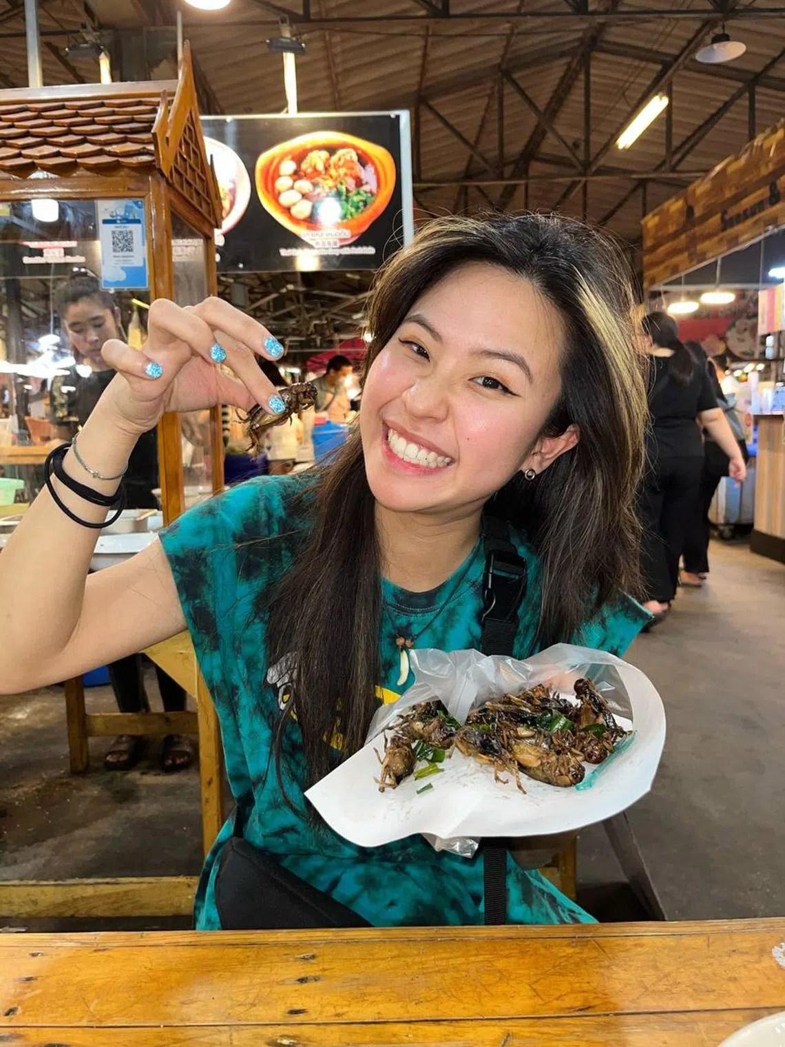 Ms Nicolette Wee eating fried grasshoppers at a street market in Thailand.
