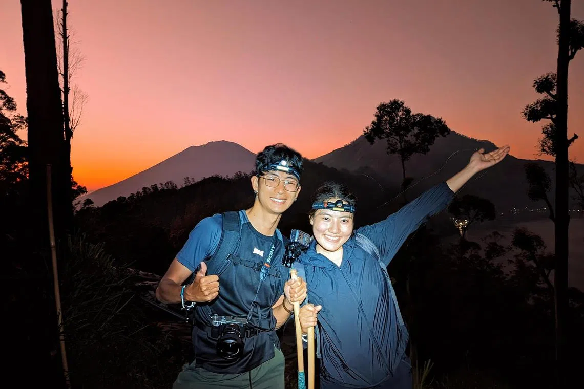 Mr Ng Yi Yang, 28, pictured with a travel companion, climbing Mount Batur in Bali, Indonesia.