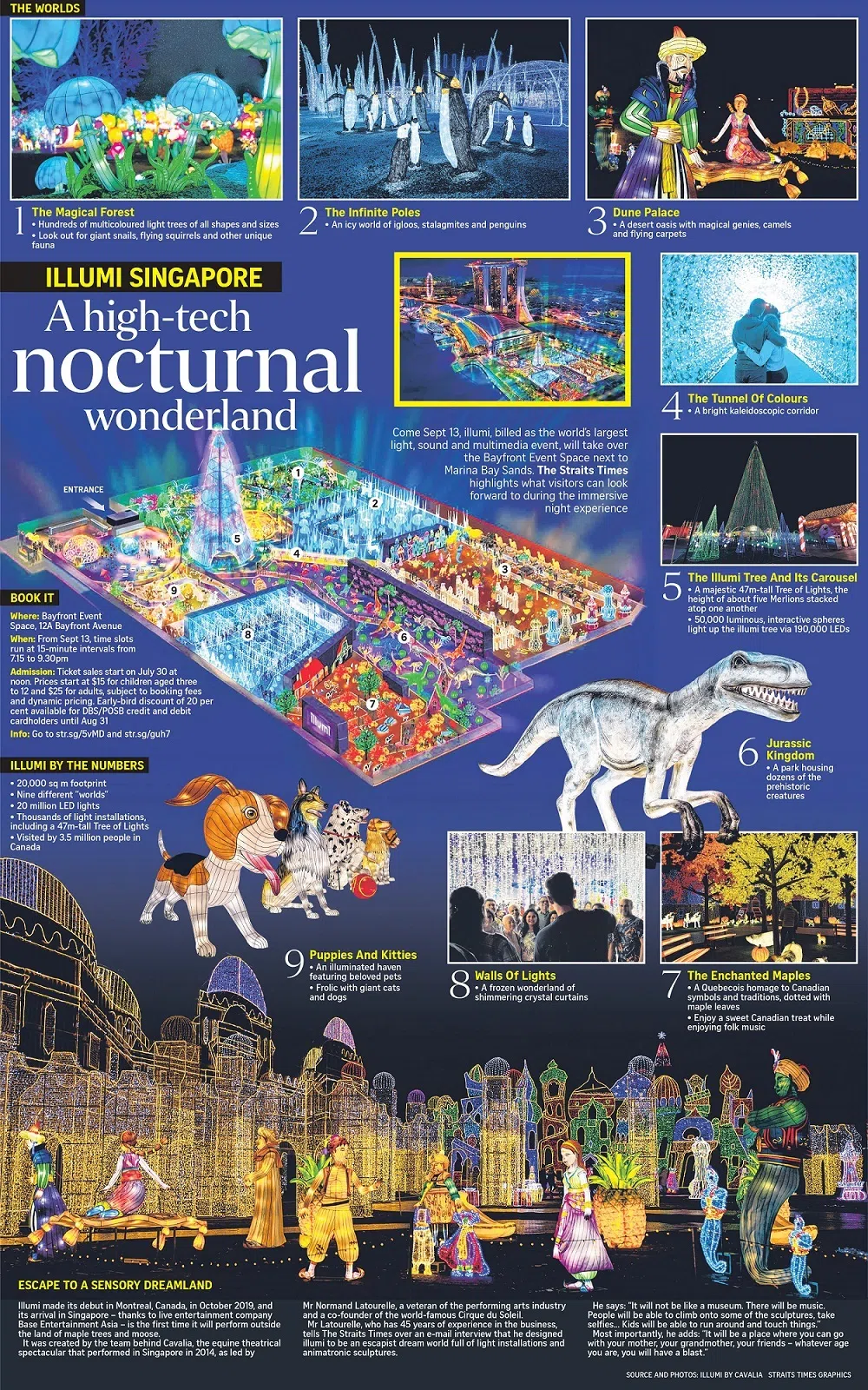 Mr Latourelle, who has 45 years of experience in the business, tells The Straits Times over an e-mail interview that he designed illumi to be an escapist dream world full of light installations and animatronic sculptures.
