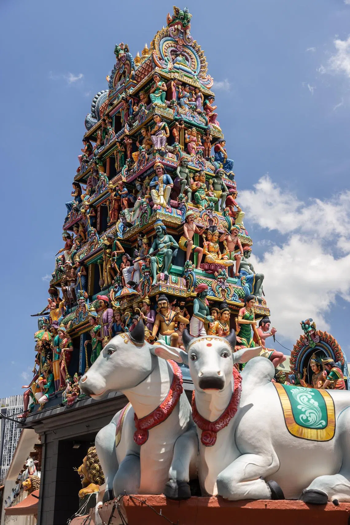 Sri Mariamman Temple was designed according to ancient South Indian temple architecture, which features an imposing tower or gopuram with ornate and colourful figurines depicting mythological characters and deities.