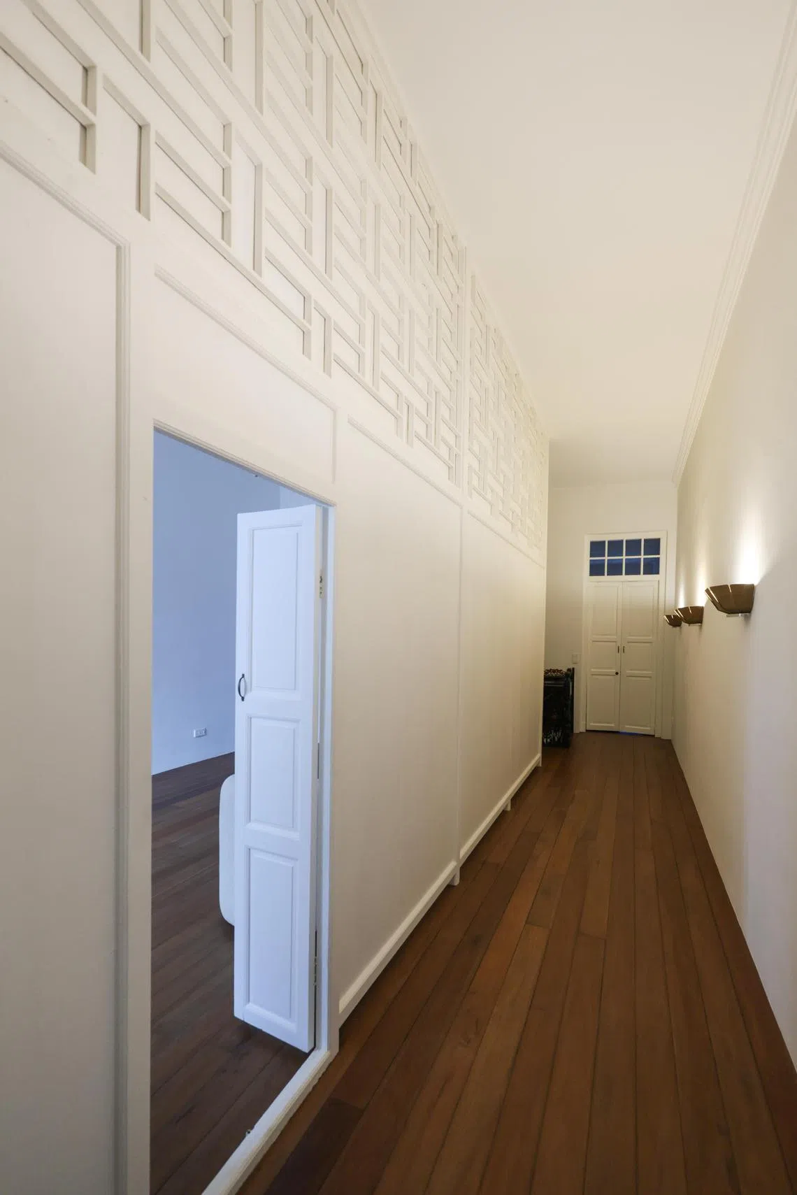 Experts from Foo Woodmaking carefully removed the timber panels in the home for off-site restoration. They also removed thick layers of paint on windows and doors accumulated after almost a century of use to restore the functionality of the louvred panels.