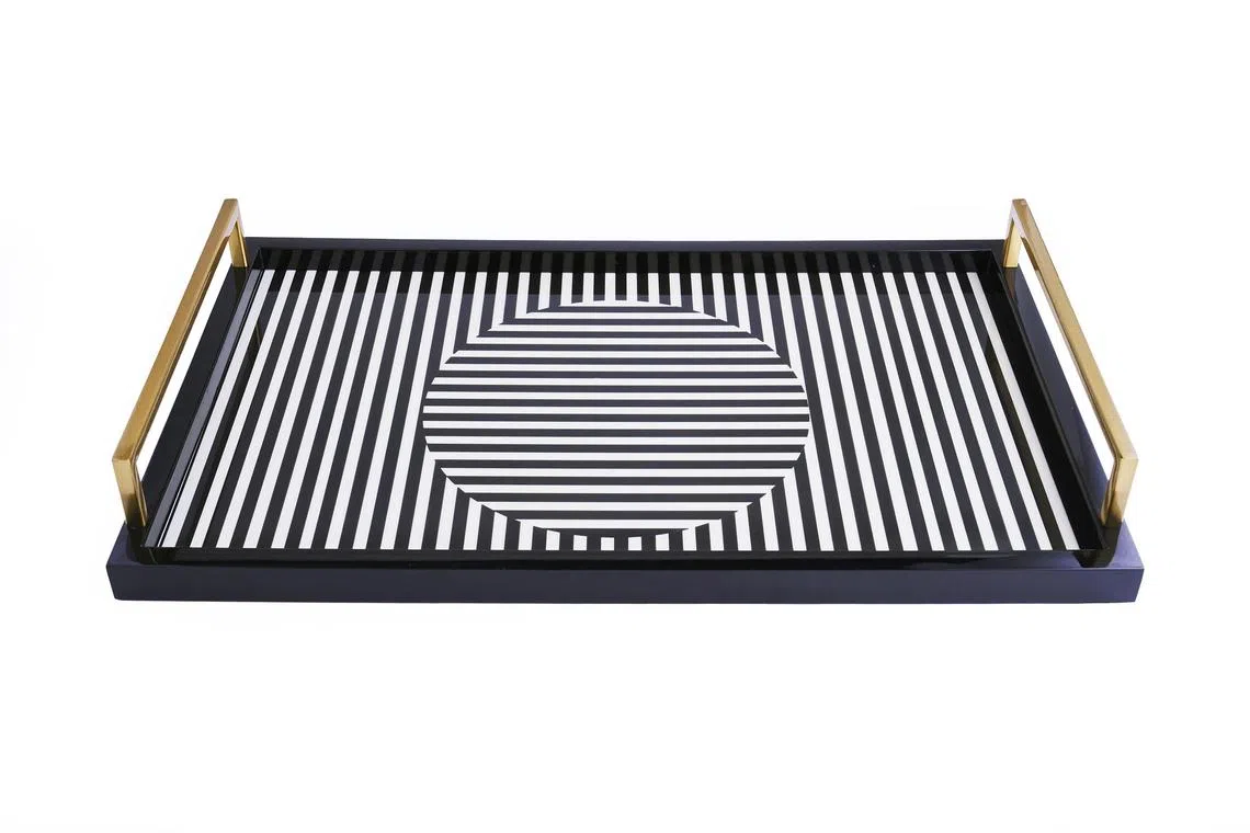 Their brand’s designs – from the Art Deco serving trays (from $158) to the Helix Tissue Box ($138) – feature stylised geometric patterns coated in piano lacquer, a high-quality glossy lacquer variety which is hardy and retains its shine.